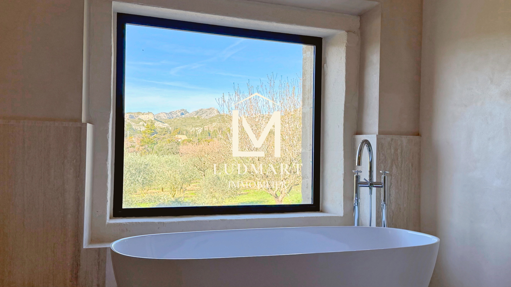 Dès les premiers instants, la propriété impose une émotion : une vue panoramique saisissante sur le massif des Alpilles, omniprésente et parfaitement mise en scène.