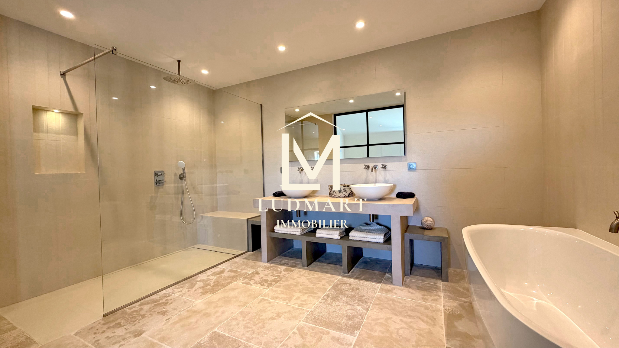 piscine intégrée dans le paysage, pool house avec cuisine d’été, multiples espaces de réception en plein air… le tout dans un calme absolu, sans aucune nuisance.
