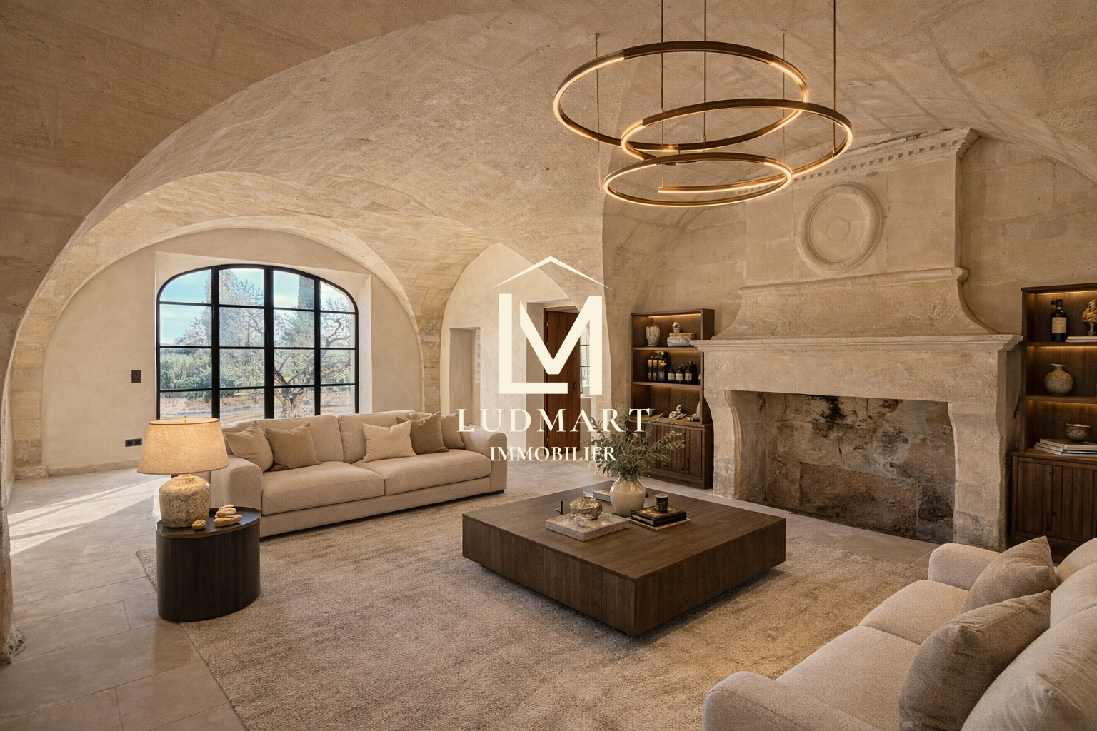 Une majestueuse salle de réception voûtée, sublimée par une cheminée d’époque